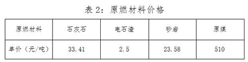 4.5電石渣制水泥相比石灰石制水泥能耗降低、成本減少。就我廠目前使用的原燃材料價格情況,如表2所示: