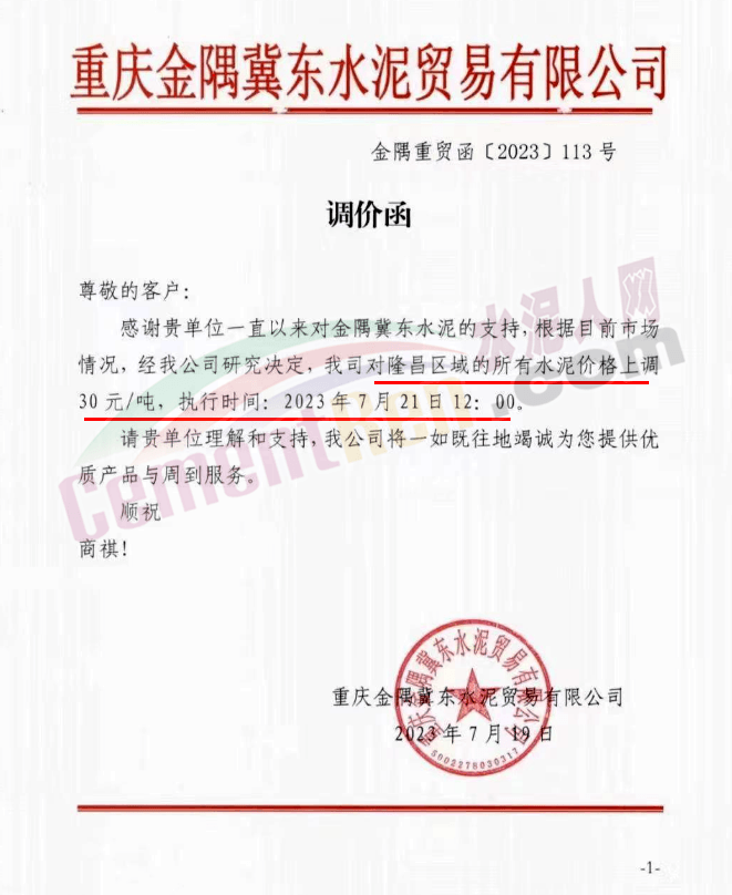 近日重慶金隅冀東水泥貿易有限公司根據目前市場情況,經公司研究決定,對隆昌、富順區域的所有水泥價格上調30元/噸,執行時間分別為2023年7月21日12時和16時。