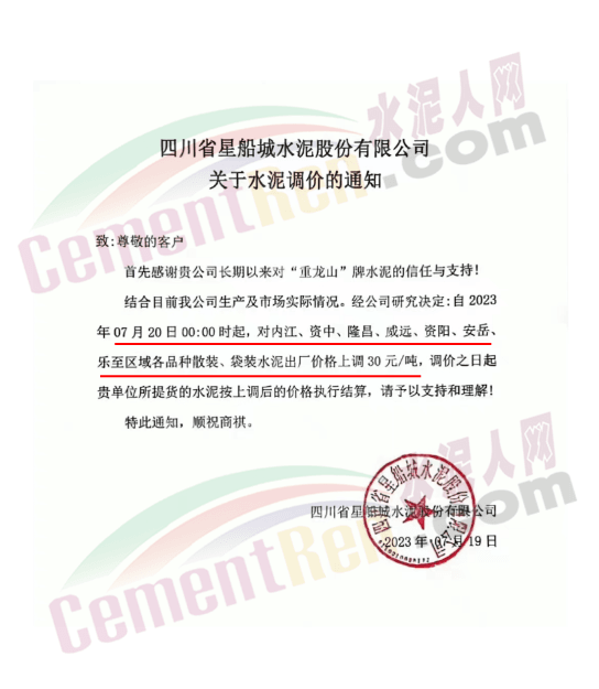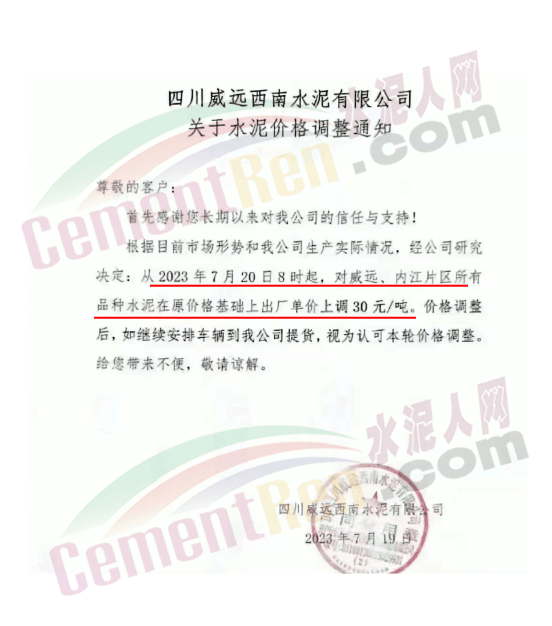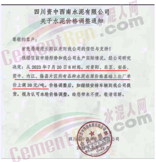 四川資中西南水泥通知,從2023年7月20日8時起,對資陽、樂至、安岳、資中、內江、隆昌片區所有品種水泥在原價格基礎上出廠單價上調 30元/噸。