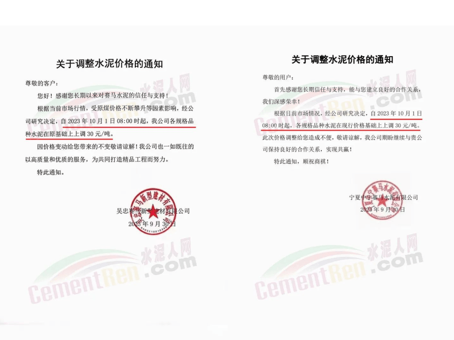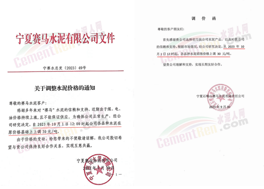 10月1日,寧夏賽馬水泥、寧夏吳忠賽馬,寧夏中衛賽馬、寧夏石嘴山賽馬等企業陸續通知,各規格品種水泥在原基礎上上調30元/噸。