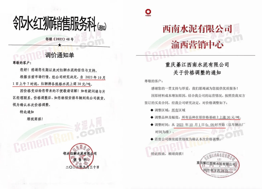 10月1日重慶金隅冀東、華新水泥、紅獅水泥、西南水泥渝西營銷中心等主要品牌企業通知,上調水泥價格30元/噸。