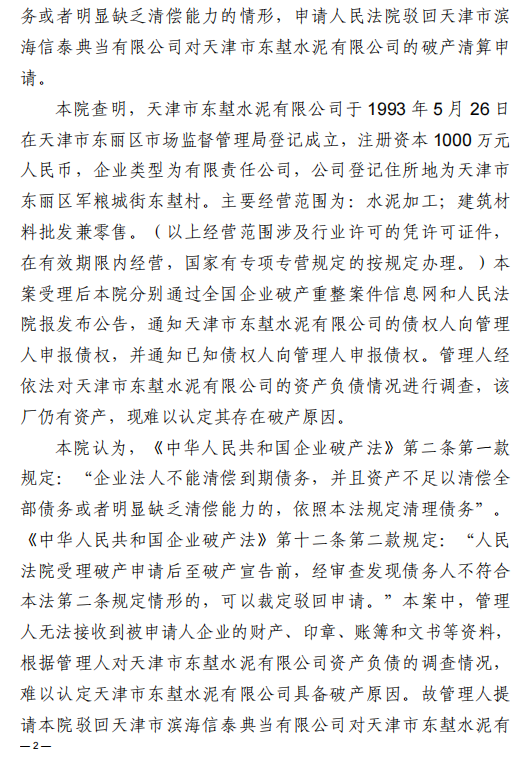2023年7月21日,管理人向天津市第二中級人民法院提交申請稱,天津市東堼水泥有限公司相關人員下落不明,管理人未能接收到天津市東堼水泥有限公司的財產、印章、賬簿和文書等資料,經管理人依法對天津市東堼水泥有限公司的資產負債情況進行調查,該廠仍有資產,現難以認定其存在破產原因。法院于8月2日裁定駁回天津市濱海信泰典當有限公司對天津市東堼水泥有限公司的破產清算申請。