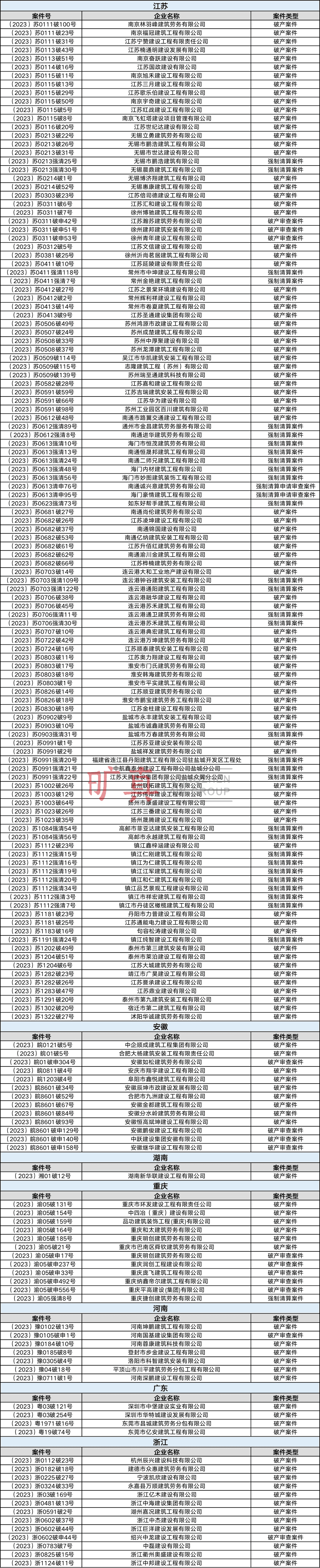 從2023年1-8月全國建筑企業破產重整案件匯總名單(見附件)可見,占比較大的仍是江蘇省。一位項目經理介紹稱,老家江蘇,一個縣就有好幾家特級總承包。而今這些“特級”也都已經入列破產名單了,這些破產公司的員工絕大多數都回鄉了。
