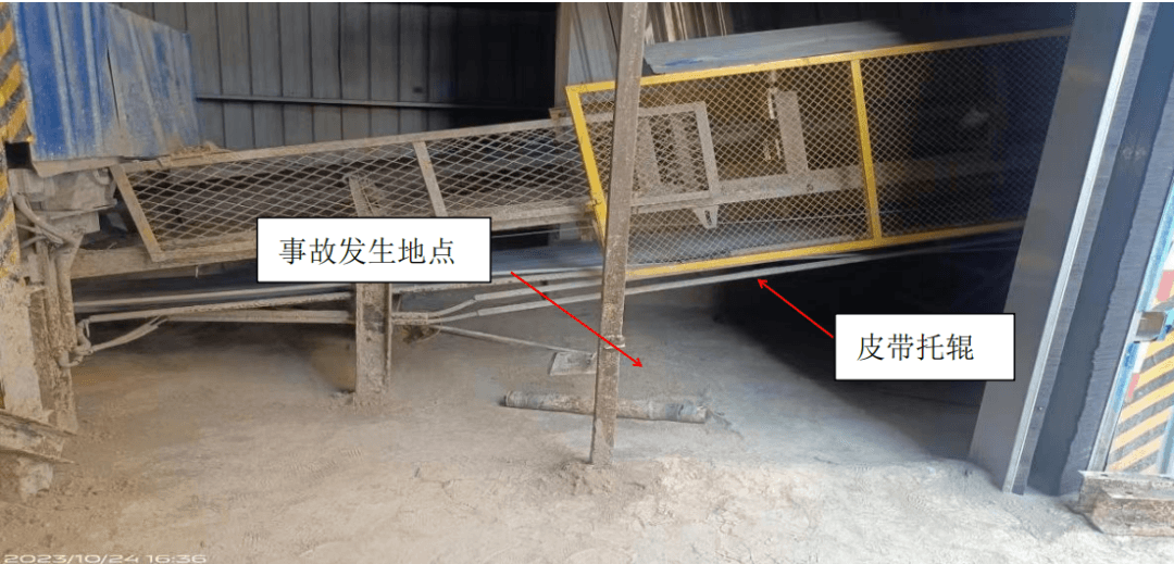 經現場勘查、問詢,查閱資料,初步分析,該工人清理積料時進入運轉的皮帶機下部,由于該部位高度較低(1.05米),周圍較為狹窄,在用手持刮板工具清理積料時,右臂肘部被卷入下部皮帶托輥與皮帶之間,進而帶動身體回轉,造成頭部被卷入托輥與皮帶之間,導致事故發生。