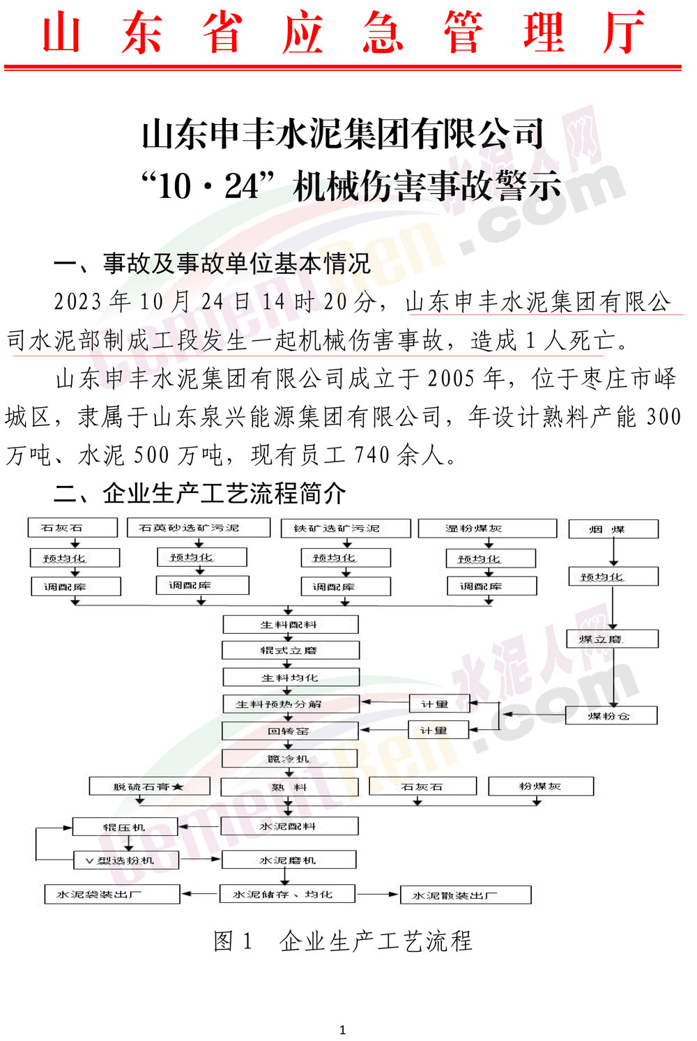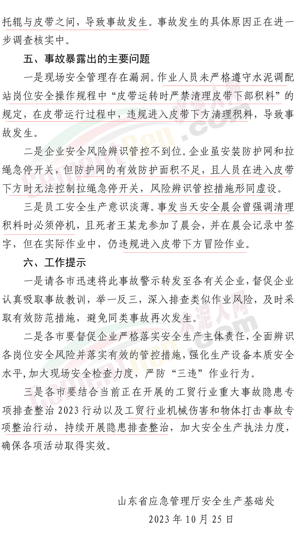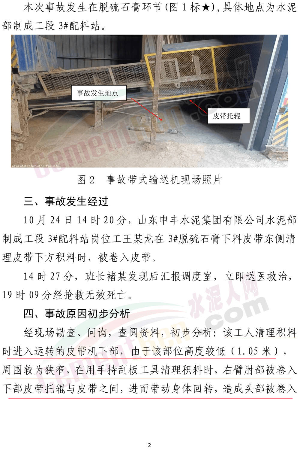 2023年10月25日,山東省應急管理廳發布了一則《事故警示》。其中提到:10月24日14時20分,山東申豐水泥集團有限公司水泥部制成工段3#配料站崗位工王某龍,在3#脫硫石膏下料皮帶東側清理皮帶下方積料時,被卷入皮帶。14時27分,班長褚某發現后匯報調度室,立即送醫救治,19時9分經搶救無效死亡。