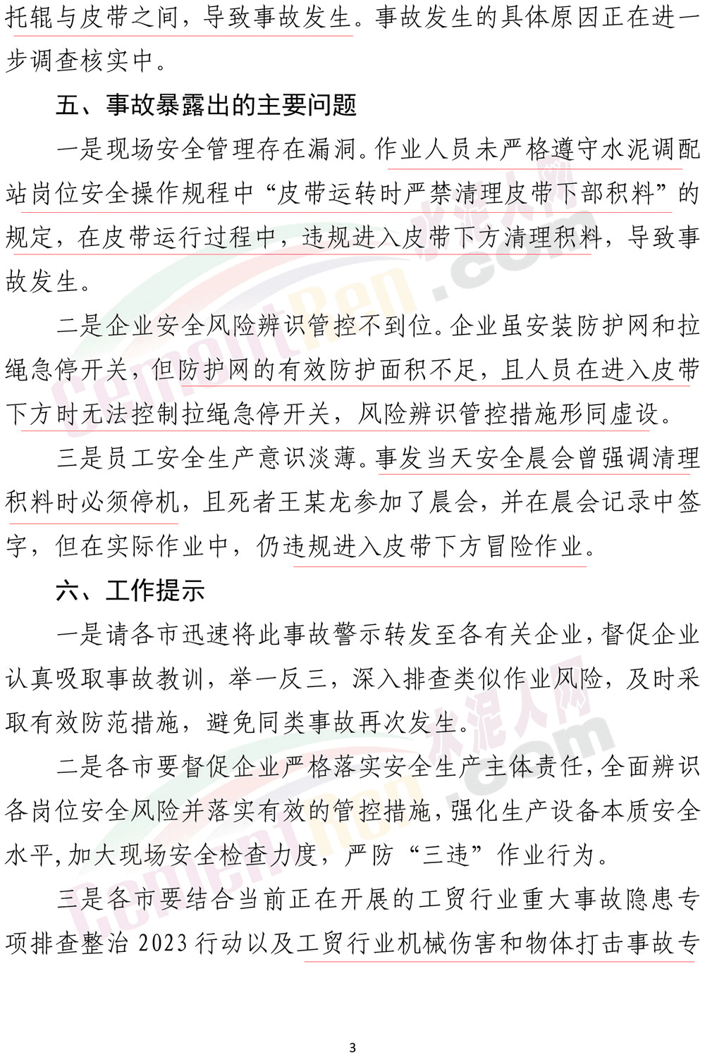 一是現場安全管理存在漏洞。作業人員未嚴格遵守水泥調配站崗位安全操作規程中“皮帶運轉時嚴禁清理皮帶下部積料”的規定,在皮帶運行過程中,違規進入皮帶下方清理積料,導致事故發生。