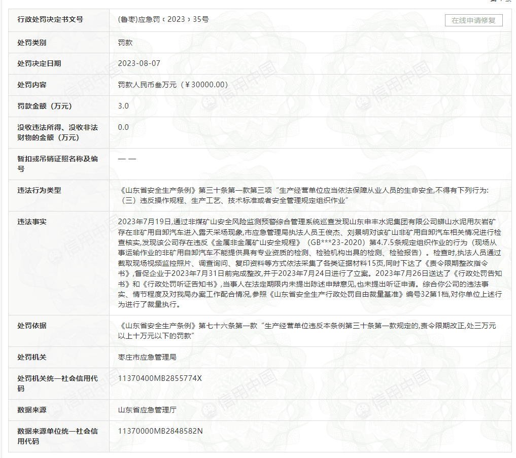 今年8月7日,棗莊市應急管理局依據《山東省安全生產條例》曾對申豐水泥公司處以3萬元罰款。處罰原因為:企業水泥用灰巖礦存在非礦用自卸汽車進入露天采場現象。