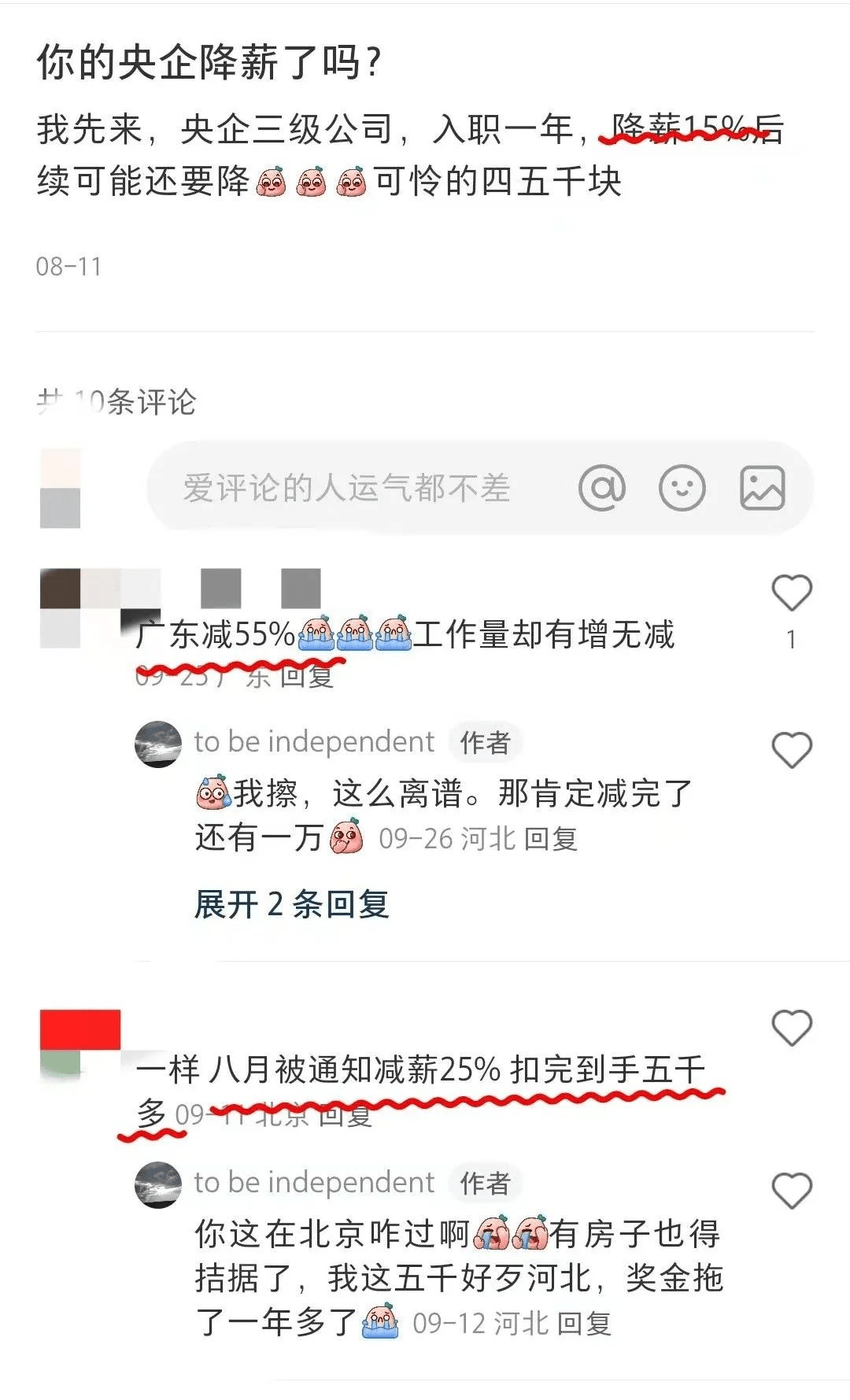 網友爆料說:某軍工央企,過完年開始部門考核,個人績效考核,完成當月指標情況下工資不變,未完成的績效低,工資降低。上個月非常多員工工資都少了,很多人到手六千多,也就是變相降薪的一種方式,本來就是996的工作強度,現在又開始變相降薪。“現在的國央企,員工能進能出、領導能上能下、薪酬能增能減是標配,人效提升是大勢所趨”。