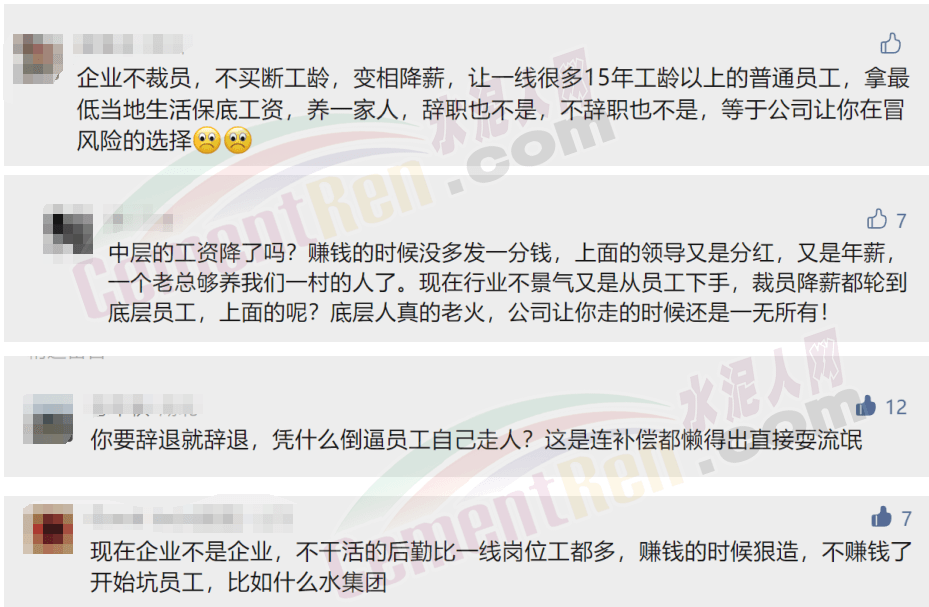 降薪、考核,取消各類獎金、福利、補貼已經不只是個別企業,而是大多數企業的普遍做法了。不僅如此,如塔牌水泥,關閉兩家粉磨站出清低效產能,員工全部解除合同在水泥行業也不在少數。每天都有水泥企業生產線、設備、股權登上拍賣平臺,也意味著每天都有一眾水泥人解除合同失去工作或正在失去工作的路上。