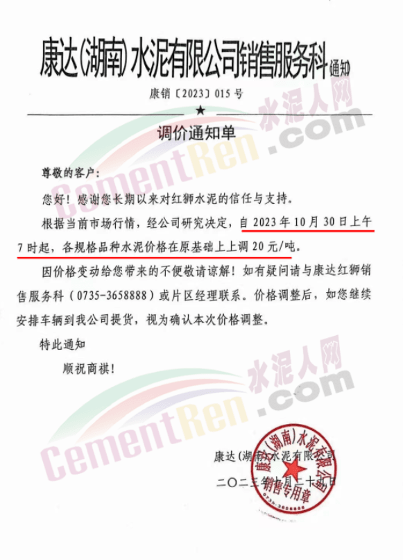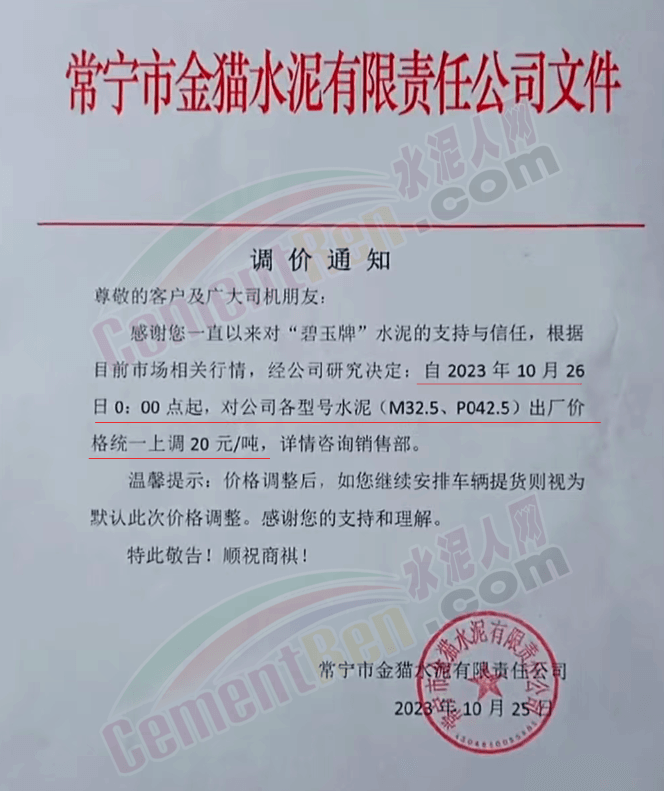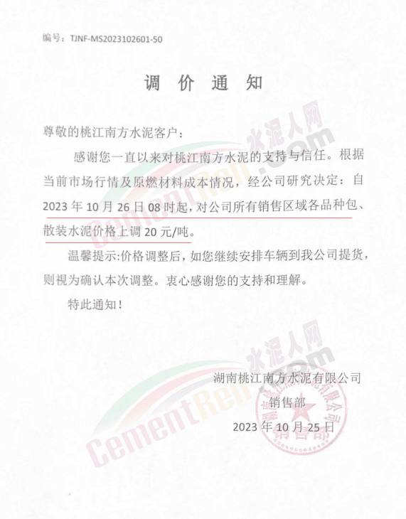 近來受原材料價格上漲和經濟政策的刺激,廣東、湖南、山西、陜西多地包括海螺水泥在內的多家品牌企業通知上調報價。廣東東莞鵬潤建材有限公司通知,根據目前的市場情況,從10月26日8時起公司供應的海螺全品項散裝水泥上調20元/噸。