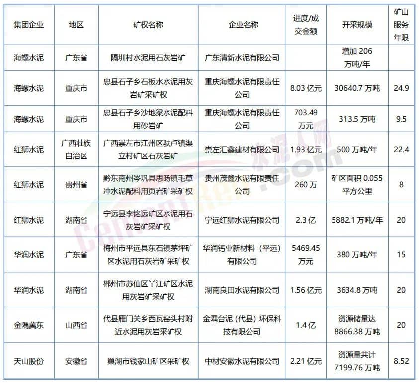 據水泥人網了解,今年以來行業頭部企業海螺水泥、紅獅水泥、金隅冀東、天山股份等企業均有在各地拿礦,擴充現有產能資源。