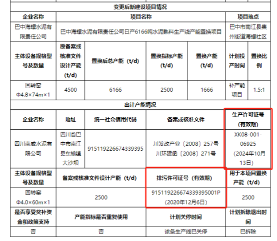 本次置換方案中,出讓方四川南威水泥有限公司生產許可證有效期至2024年10月13日,排污許可證有效期至2020年12月6日,截至本次變更方案公示,四川南威水泥有限公司生產許可證已過期5個月,排污許可證過期已超過4年