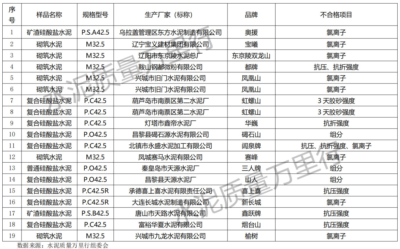 另一方面是質量達標率偏低。80批次樣品中,19批次檢測結果不符合國家標準要求,占比23.75%。不合格項目集中在氯離子含量、強度性能及組分三大類:其中,興城市舊門水泥有限公司、遼陽市東京陵水泥總廠等8家企業的產品氯離子超標;鞍山鋼都微粉有限公司“都牌”砌筑水泥等6批次產品,同時存在抗壓與抗折強度不合格問題;昌黎縣碣石源水泥有限公司、秦皇島市天源水泥廠等企業的3批次產品,因組分不符合標準。