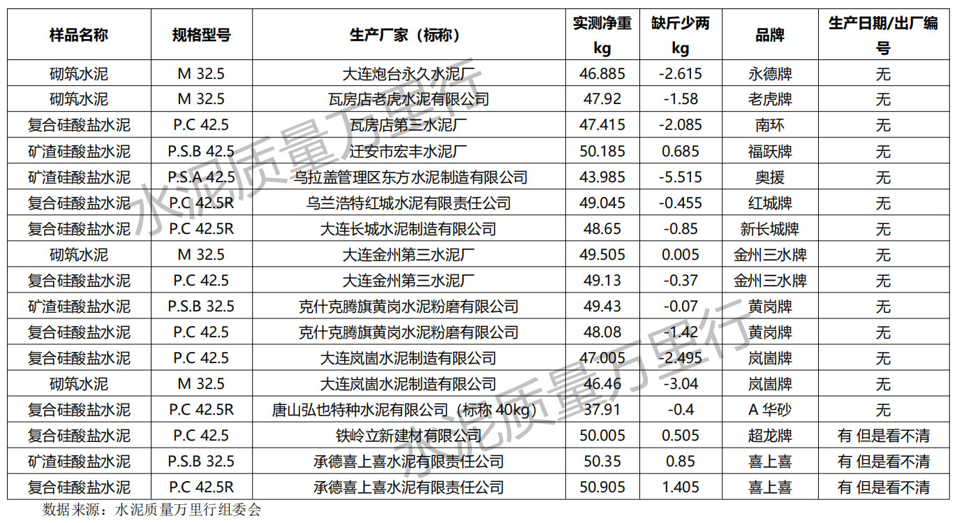 近日,水泥質量萬里行組委會發布泛東北地區流通領域水泥抽檢新結果。在已完成的80批次抽檢中,袋重不足問題突出,同時近四分之一產品存在質量不達標情況,部分企業還涉嫌資質與商標違規。